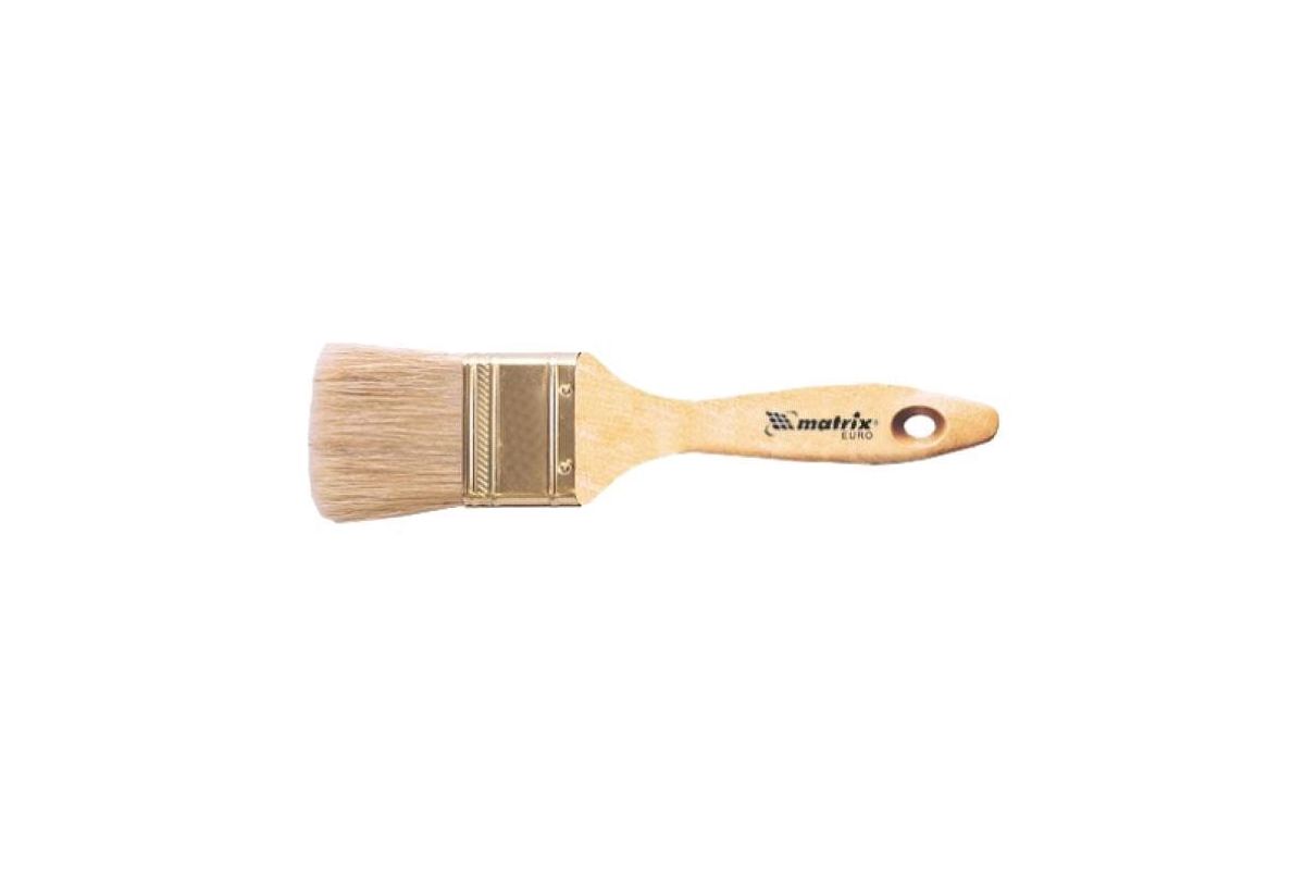 Ворс кисти из натуральной щетины двойной выварки. Щетина расщеплена на концах. Толщина кисти от 10,5 до 22 мм. Щетина кисти надежно закреплена металлическим бандажом с антикоррозийным покрытием. Деревянная лакированная ручка с отверстием для подвешивания.
