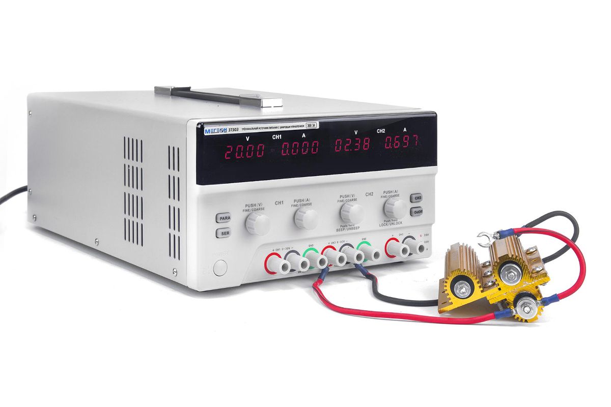 МЕГЕОН 37303 это компактный, высокоточный, трёхканальный источник питания с цифровым управлением. Два канала источника имеют выходное напряжение 0…30 В с током нагрузки 0…3 А, и фиксированный переключаемый источник напряжением 2.5В, 3.3В или 5 В с током нагрузки до 3 А. В источнике реализовано: раздельное цифровой управление, независимая цифровая индикация напряжения и тока, возможность грубой и точной установки значений напряжения и тока в двух каналах до подключения нагрузки. Три режима работы: независимый, параллельный и последовательный. Включение и выключение выходного напряжения двух каналов в одно нажатие. Термокомпенсация, компенсация по току и подавление пульсаций. Защита от короткого замыкания на выходе. Прибор найдёт широкое применение в учебных и исследовательских целях, при разработке и ремонте радиотехнических устройств, кроме этого подходит для промышленного применения.